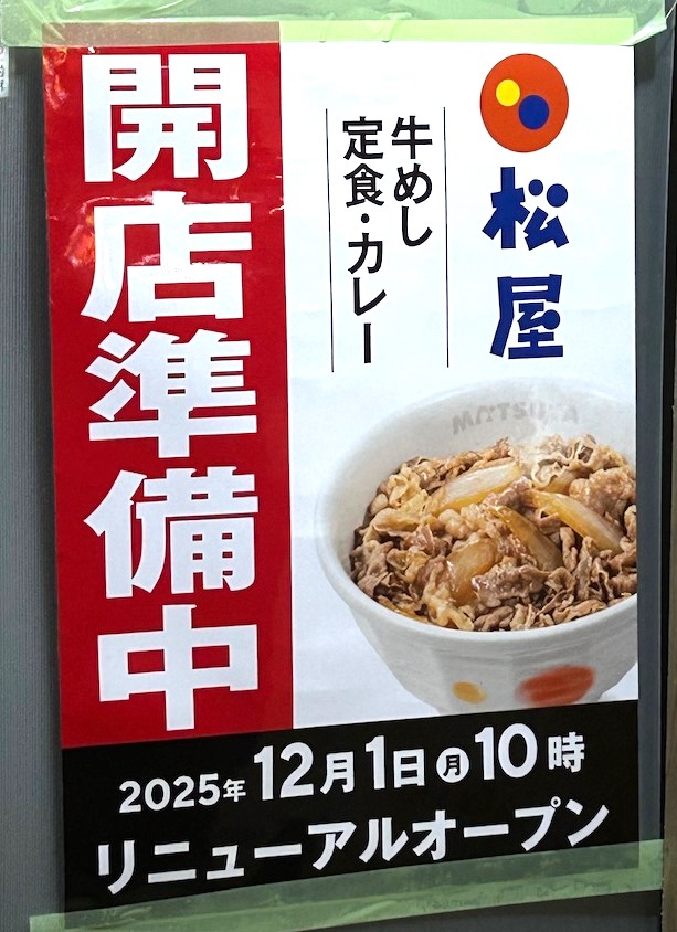 松屋南行徳店が改装のため臨時休業、12/1リニューアルオープン