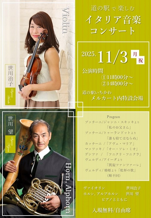 11月3日(月・祝)には、市川市在住の音楽家によるイタリア名曲の生演奏を開催されます。