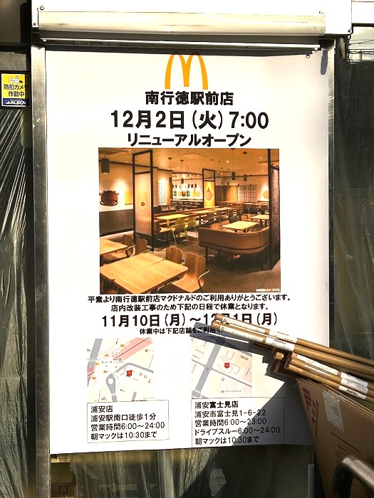 マクドナルド南行徳駅前店が改装工事のため臨時休業、12/2(火)リニューアルオープン