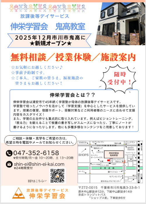 子どもたち一人ひとりの成長と自立を応援する放課後等デイサービス「伸栄学習会」が、このたび市川市鬼高エリアに新たな教室をオープンします。