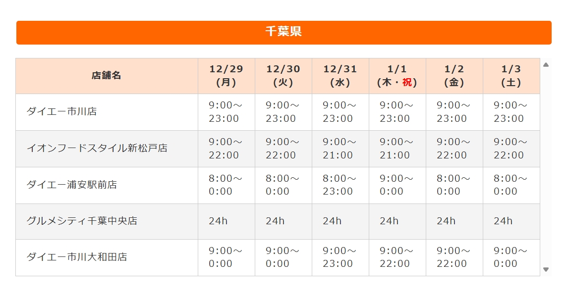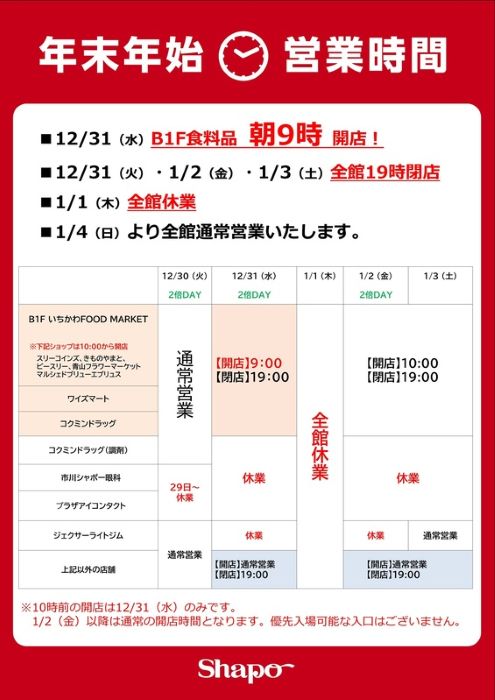 2025-2026年、市川市内(近隣地域)のスーパー(一部)・商業施設・公共施設(図書館など)年末年始の営業時間についてです。