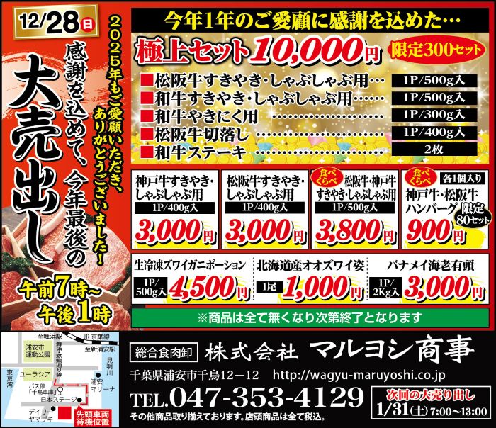 12/28(日)浦安・総合食肉卸「マルヨシ商事」の大売出しがあります。