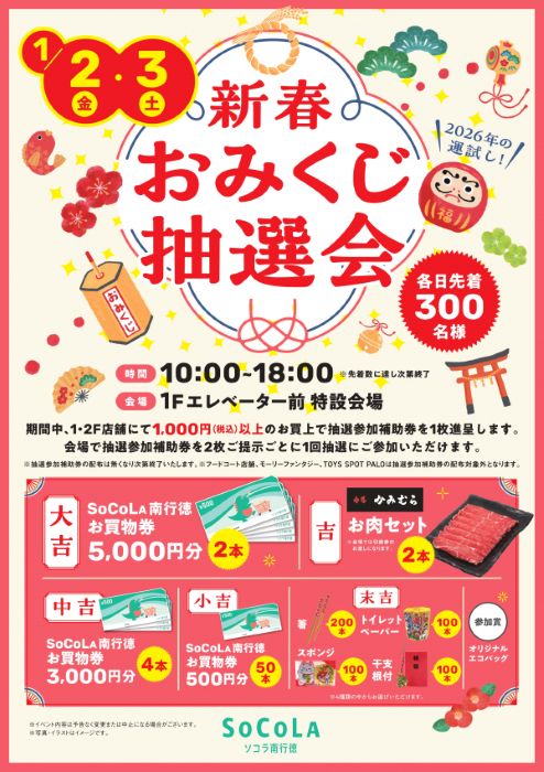 1/2(金)3(土)ソコラ南行徳にて「2026 新春おみくじ抽選会」開催中