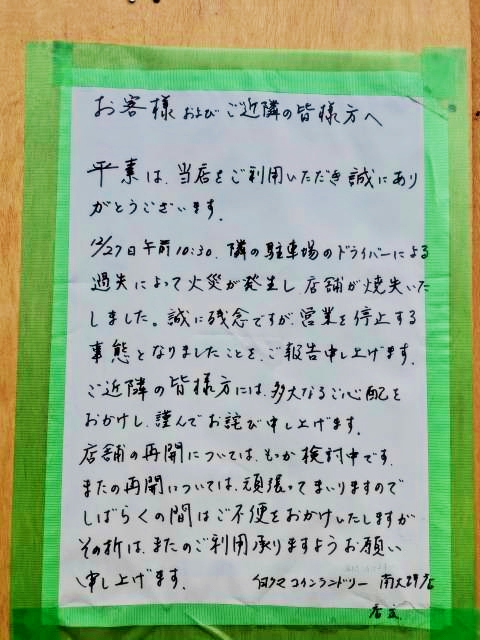 12/27(土)市川市南大野1丁目で車の衝突による火事により店舗が焼失した白クマコインランドリー南大野店ですが、店頭に掲示があり営業再開を検討中ということです。