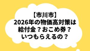 2026/01/09 【市川市】 2026年の物価高対策は給付金?おこめ券? いつもらえるの? スポンサードリンク 読んでいただきありがとうございます。よろしければシェアしてください。 facebook Twitte Google+ はてな イチ子 「市川にゅ~す」運営者。2015年9月より地域ブログ運営。市川育ち。犬好き。 2026/01/09 関連記事 の最新記事 かまくら・なまはげ祭り2026が1/17(土)18(日)コルトンプラザにて開催されますよ、秋田物産展も くふ楽本八幡店が1/31(土)をもって閉店、建物たて替えのため、27年の歴史に幕 久麺や 八幡店が南八幡に1/15(木)オープン 【無料送迎バスも】舞浜ユーラシアが1/15(木)リニューアルオープン、温泉施設&レストランも全面改装 ダイエー市川店4Fで売り尽くしセールが開催中 【ららぽーと東京ベイ】マザー牧場カフェ&ソフトクリームが1/30(金)オープン 本八幡北口の糸信ビルの建替え工事進捗状況 1/17(土)市川市文化会館ニューイヤーフェスティバル2026が開催されますよ、事前申込不要・入場無料 コンビニ「ニューデイズ松戸改札内」が1/16(金)をもって閉店 イオンモール船橋のみずほ銀行ATMが1/18(日)をもって閉店