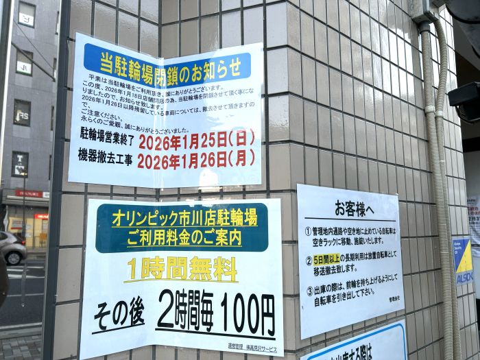 オリンピック市川店の駐輪場は1/25(日)をもって営業終了、1/26(月)機器撤去工事