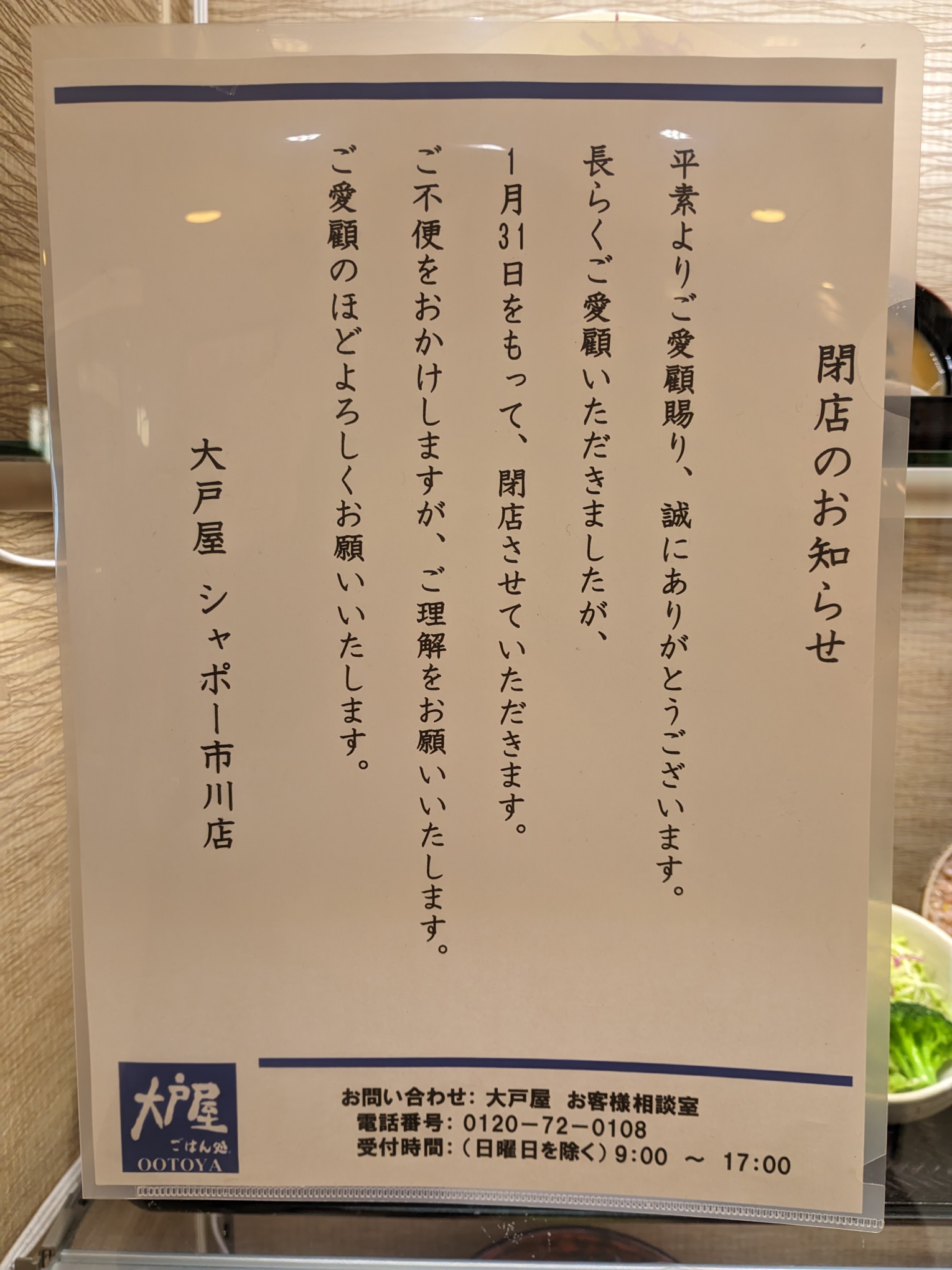 【やはり閉店】大戸屋シャポー市川店は1/31(土)をもって閉店