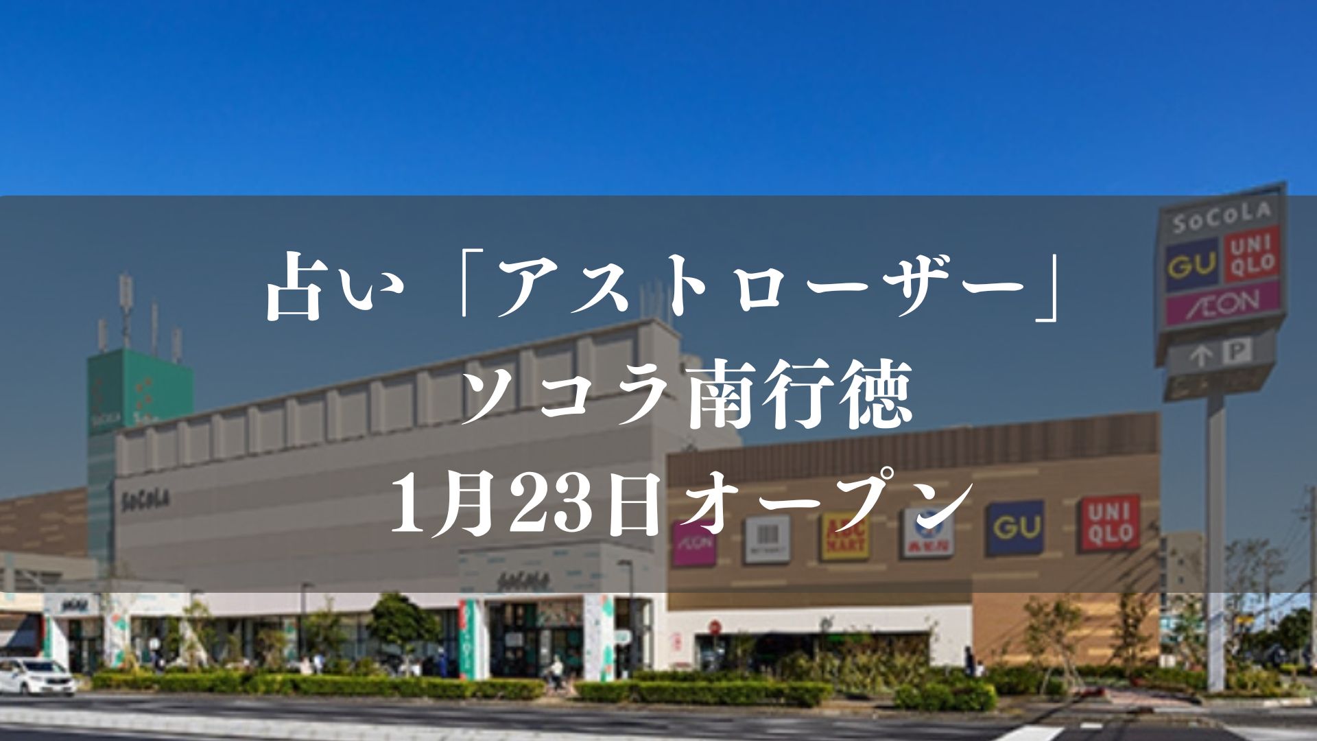 2026/02/07 占い「アストローザー」がソコラ南行徳に1/23オープン 南行徳, 開店・閉店 , 南行徳駅 占い「アストローザー(ASTROLOGER)」がソコラ南行徳に1/23オープンしました。 スポンサードリンク 占いアストローザーがソコラ南行徳に1月オープン お店はこちら、市川市南行徳2-20-25 ソコラ南行徳2Fに開店しました。 関連リンク:アストローザー 関連リンク:ソコラ南行徳 スポンサードリンク 読んでいただきありがとうございます。よろしければシェアしてください。 facebook Twitte Google+ はてな イチ子 「市川にゅ~す」運営者。2015年9月より地域ブログ運営。市川育ち。犬好き。 2026/02/07 南行徳, 開店・閉店 , 南行徳駅 前の記事:【抽選申込受付中】市川市在住・フィギュアスケート中井亜美選手... 関連記事 開店・閉店の最新記事 占い「アストローザー」がソコラ南行徳に1/23オープン 【アトレ新浦安の開店・閉店情報】食料品ゾーンのリニューアル工事が行われています 本八幡に夜パフェのお店「アンドヴィーゴ(&VIGO)」が2/6オープン予定、お酒の美術館があるところ てけてけ浦安店が12/30をもって閉店 市川南にインド・ネパール料理店がオープン予定、わくわく広場があったところ 妙典にラーメン屋「瑞乃麺」が3月オープン予定、杏樹亭があったところ 南大野の喫茶店「バイエルン」が2/20(金)をもって閉店 ラーメン「中華そば サンちゃん」が船橋に2/2(月)オープン 妙典・華風伝跡地にレストランがオープンするみたい 市川真間駅前に占い「龍門精舎市川店」が1月オープン