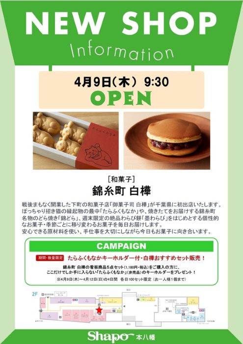 和菓子「錦糸町 白樺 シャポー本八幡店」が4/9(木)オープン、期間・数量限定・非売品キーホルダープレゼントも