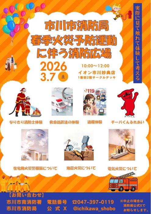 3/7(土)市川市消防局「春季火災予防運動に伴う消防広場」がイオン市川妙典にて開催されますよ。