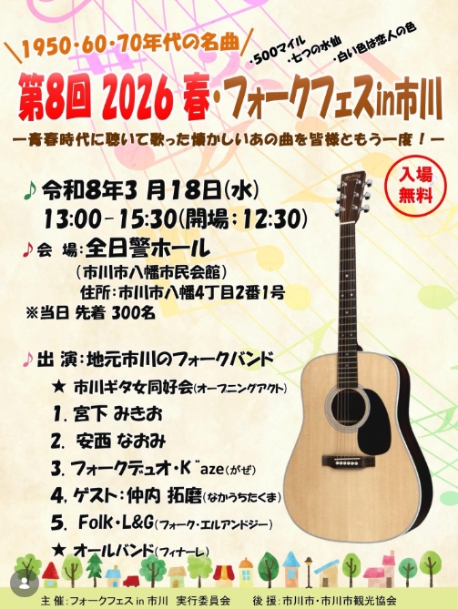 3/18(水)第8回2026フォークフェスin市川が本八幡・全日警ホールにて開催されますよ、入場無料
