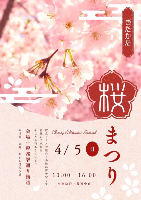 4/5(日)きたかた桜まつりが税務署通り横道にて開催されますよ、飲食ブースや屋台も【2026】
