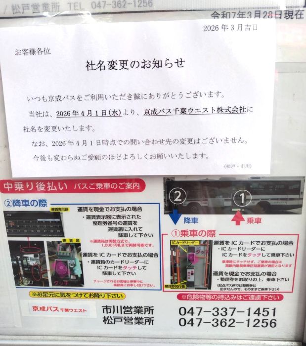 京成バスが2026年4月より社名を変更し、市川・松戸エリアは京成バス千葉ウエストになりました。
