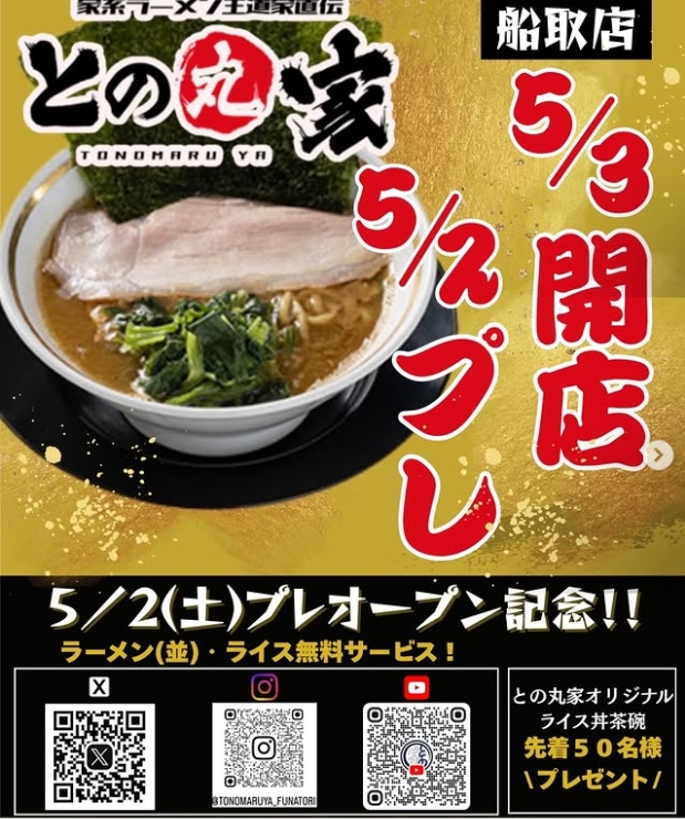 家系ラーメン王道家直伝「との丸家 船取店」が5/3(日)オープンします。